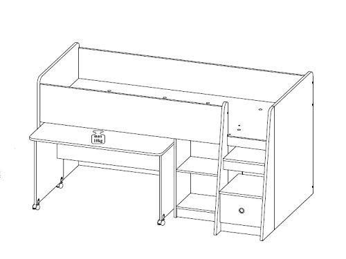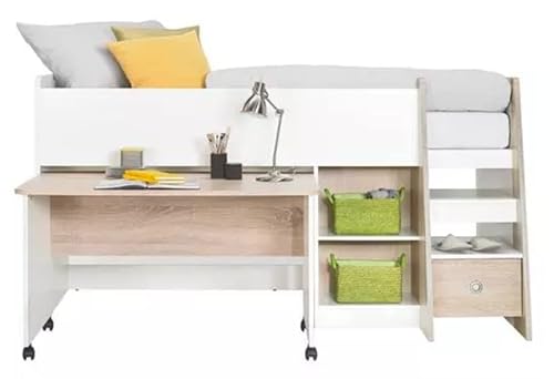 Letto a soppalco multifunzionale con scrivania e scaffale incorporato, design moderno e molto salvaspazio. Lo sgabello come da foto e materasso NON sono compresi, rete a doghe non sono necessarie. La scaletta comprende 2 vani aperti e 1 cassetto, vicino si trovano altri 2 scompartimenti aperti, che offrono molto spazio di archiviazione. La scrivania è facilmente estraibile grazie alle ruote ed è perfettamente integrata nello spazio sotto il comodo letto. Il letto è dotato di protezione laterale.
