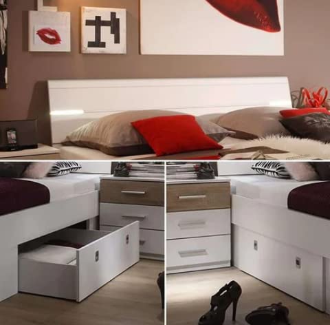 Struttura letto matrimoniale con 2 comodini e 2 cassettoni salvaspazio integrati, allestita con Illuminazione LED inserita nella testiera. Materasso e rete a doghe NON inclusi. Il comodino è dotato di 3 cassetti, di cui quello in alto è di un altro colore, che crea un bel effetto. I cassettoni si trovano sui due lati sotto il letto e offrono posto per biancheria da letto. Il design è moderno, giovanile e pratico, non parlare della comodità. Dormirci è un vero sogno.
