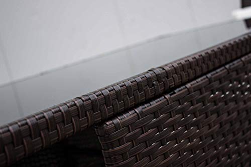 Materiale: rattan sintetico, vetro, colore struttura: marrone scuro, colore piastra del tavolo: nero, cuscini: in microfibra bianca, stuttura stabile e robusta, consigli per il trattamento: Non usare detergenti di pulizia abrasivi