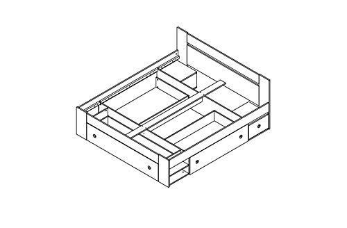 Fusto di letto matrimoniale con 2 comodini e 3 cassettoni integrati e estraibili, inoltre con 2 vani aperti per lato e struttura con testiera, dal design moderno e giovanile. Rete a doghe e materasso NON sono compresi e possono essere acquistati separatamente (vedi p.e. art. B075482N6Y e B076BNQ9L5). Il letto è molto comodo e nei 3 cassettoni c'è ampio spazio per riporre oggetti o biancheria da letto. La sua funzione salvaspazio è ideale anche per le camere matrimoniali più piccole o monolocali.