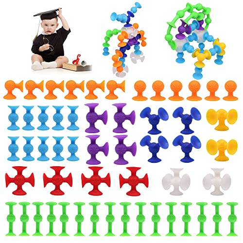 [58 pezzi]: Le 58 ventose in 9 forme diverse permettono di creare tutti i tipi di forme. Le possibilità sono infinite. Le ventose possono aderire a tutte le superfici lisce (piastrelle, specchi, frigorifero, vasca da bagno, porta, parete, ecc.) senza lasciare residui. Grazie allelevato numero di pezzi, più bambini possono giocare insieme contemporaneamente. Sicuramente il giocattolo li terrà lontani dagli schermi di TV e tablet.
