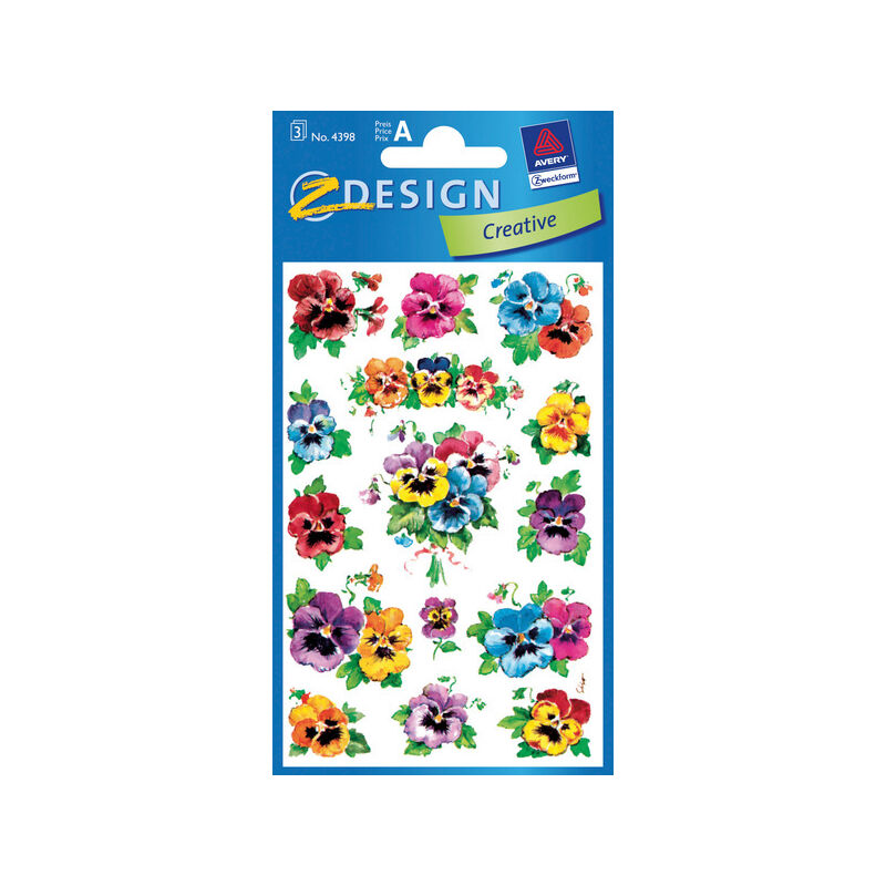 Adesivi floreali colorati, in parte con glitter o in rilievo. Dimensione foglio 76x120 mm. Numero di fogli 3. Motivo viola. Quantità: 10 set con 3 fogli.