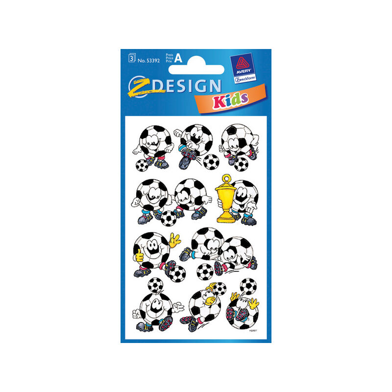 Adesivi di carta colorata, in parte con glitter o rilievo. Dimensioni foglio 76x120mm. Numero di fogli 3. Motivo calcio.