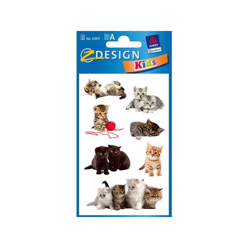 Adesivi di carta colorata, in parte con glitter o rilievo. Dimensioni foglio 76x120mm. Numero di fogli 3. Motivo foto di gatto.