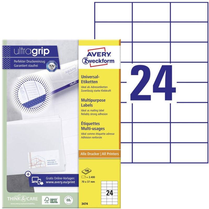 Avery 3474. Colore del prodotto: Bianco, Materiali: Carta, Tecnologia di stampa: Universale. Dimensione etichetta: A4