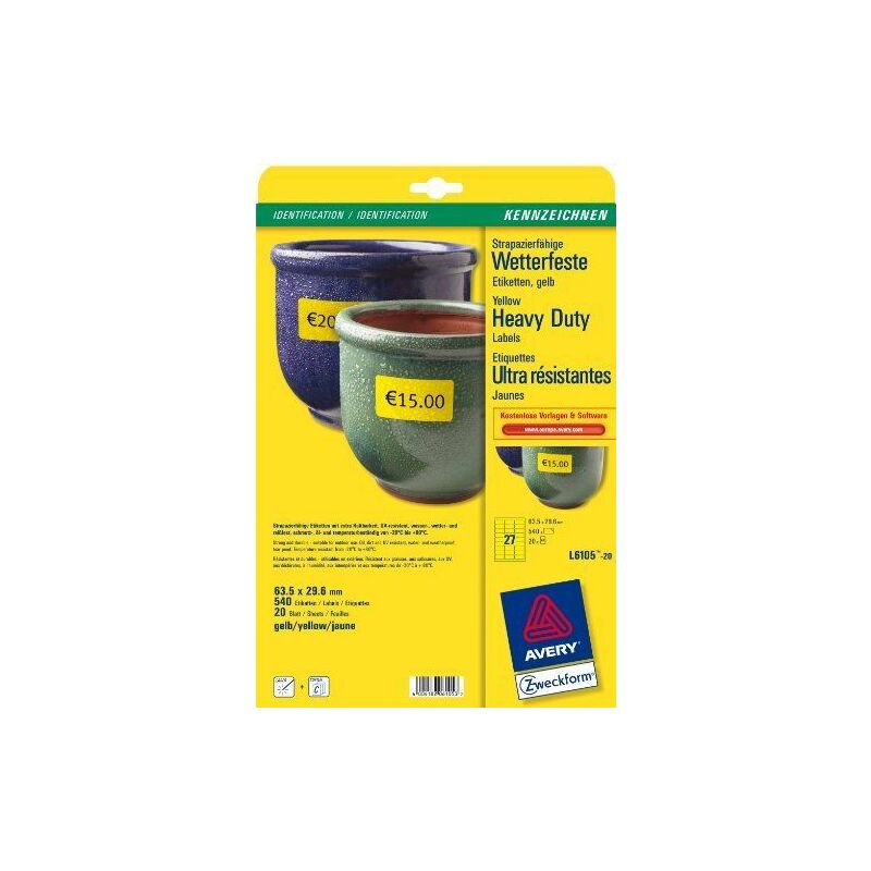 Avery Etichette gialle in poliestere - stampanti Laser, Laser a colori - dim 63,5 x 29,6 - 20ff. Colore del prodotto: Giallo, Materiali: Poliestere, Tecnologia di stampa: Laser. Label width: 6,35 cm, Label height: 2,96 cm