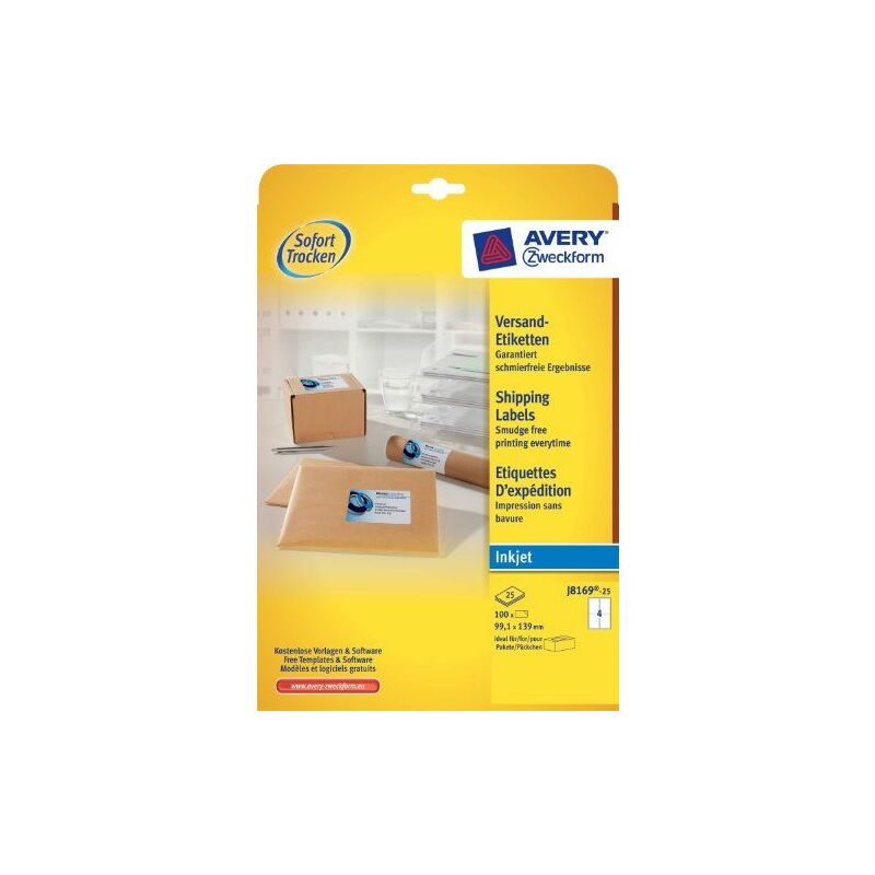 Avery J8169-25. Colore del prodotto: Bianco, Tecnologia di stampa: A inchiostro, Dimensione etichetta: 99.1 x 139 mm