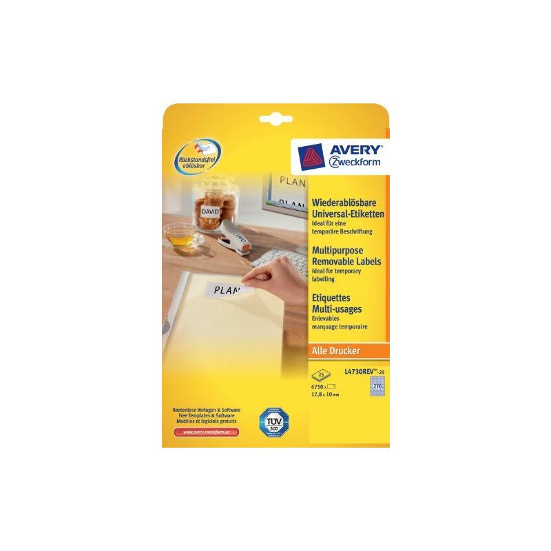 Avery L4730REV-25. Colore del prodotto: Bianco, Materiali: Carta, Tecnologia di stampa: Laser. Label width: 1,78 cm, Label height: 1 cm. Dimensioni (un foglio): 17.8 x 10 mm
