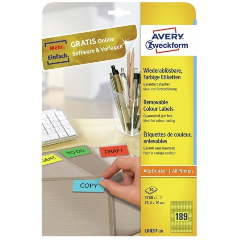 Avery L6037-20. Colore del prodotto: Giallo, Materiali: Carta, Tecnologia di stampa: Laser/Inkjet. Label width: 2,54 cm, Label height: 1 cm