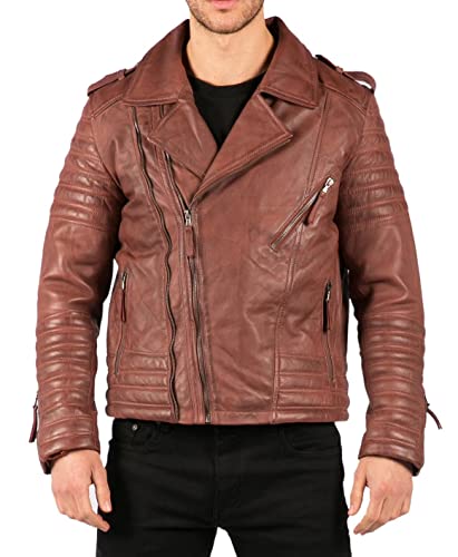 Aviatrix Giacca in Vera Pelle da Uomo con Zip Biker Marrone Legno Vintage Aderente marrone legno xxl