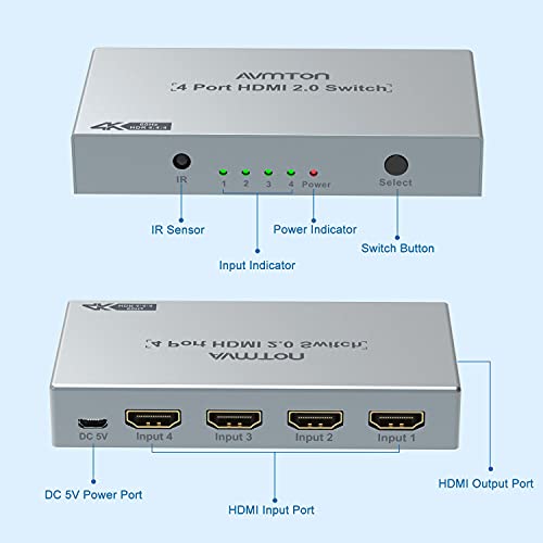AVMTON HDMI 2.0 HDMI Splitter 4 in 1 Out Hdmi Switch Telecomando, Metallo HDMI Commutatore Supporto 4K@60HZ HDCP2.2 3D HD1080P, Switch HDMI per PS4 Pro Xbox PC TV