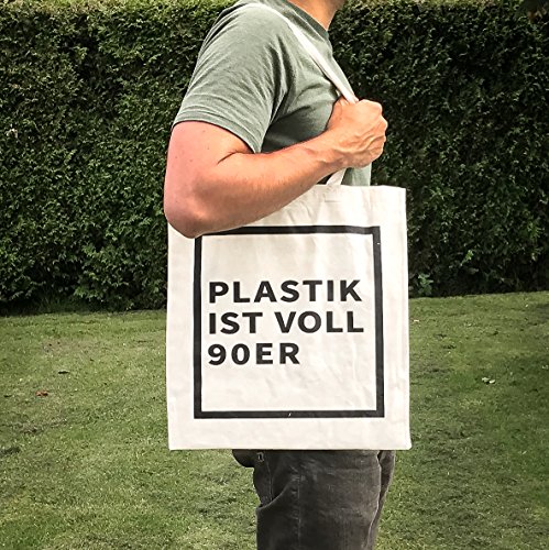 Avoid waste, borsa in iuta, stampata, con scritta in lingua tedesca "PLASTIK IST VOLL 90ER", busta sostenibile, per la spesa, con stampa e manici lunghi