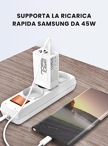 【Caricatore a 3 Porte Che Supporta più Protocolli】Dotato di 2 porte USB-C (C1 supporta PD70W Max, C2 supporta PD22W Max) e 1 porta USB-A (supporta 18W Max). Tutte le porte USB-C supportano i protocolli PD 3.0, QC 4.0+ e Samsung Super Fast Charge 2.0/PPS, mentre la porta USB-A supporta il protocollo QC 3.0