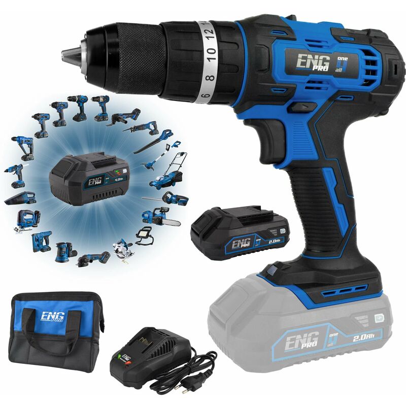 Trapano Avvitatore a Percussione - ENG PRO - 1B20-AP40-1B2 Caratteristiche tecniche: Mandrino auto-serrante in metallo Alimentazione a batteria 20V Coppia di serraggio massima di 40 Nm 2 Velocità 0-400 / 0-1500 rpm Tasso di impatto 21000 bpm Luce a LED Velocità 0 - 1500 rpm Numero percussioni 1 velocità 0 - 6000 bpm Numero percussioni 2 velocità 0 - 21000 bpm Mandrino 2 - 13 mm Coppia massima 40 Nm Regolazioni frizione 16 Peso 1750 g Batteria inclusa 1 Batteria 2.0Ah Caricabatteria incluso Si Accessori inclusi: Gancio 1 Batteria 2.0 Ah ONE4ALL Caricabatterie 2.4 A per batterie ONE4ALL Borsa porta utensili in tessuto Manuale di istruzioni ITA/ENG L'avvitatore a percussione è l'alleato perfetto per professionisti e appassionati del fai-da-te che si trovano a dover affrontare una varietà di superfici e il serraggio di viti. Grazie alla sua funzione di foratura a percussione, il battente del trapano entra in azione per creare fori rapidamente ed efficacemente. Questo avvitatore, come gli