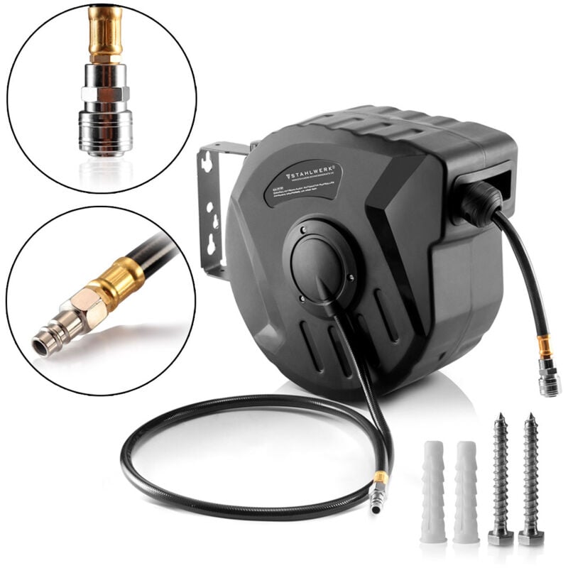 Avvolgitore automatico di tubo per aria compressa STAHLWERK da 10 m Avvolgitubo per aria compressa STAHLWERK con riavvolgitore automatico, 10+1 m, pressione di esercizio fino a 8 bar, attacco rapido standard (larghezza nominale 7,2 mm) con pratica funzione a scatto, robusto alloggiamento in plastica con set di montaggio a parete. Caratteristiche L'avvolgitubo automatico per aria compressa STAHLWERK di alta qualità, con una lunghezza di 10+1 m, funziona con una pressione di esercizio fino a 8 bar e dispone di un attacco rapido standard (larghezza nominale 7,2 mm) con una pratica funzione a scatto per una messa in funzione rapida e semplice. Un robusto alloggiamento in plastica con un potente riavvolgitore automatico mantiene in ordine il posto di lavoro e protegge il tubo dell'aria compressa dall'usura e dai danni. La lunghezza del tubo desiderato può essere facilmente selezionata grazie alla funzione di blocco. Lavoro comodo e massima flessibilità: il pratico set di montaggio a parete