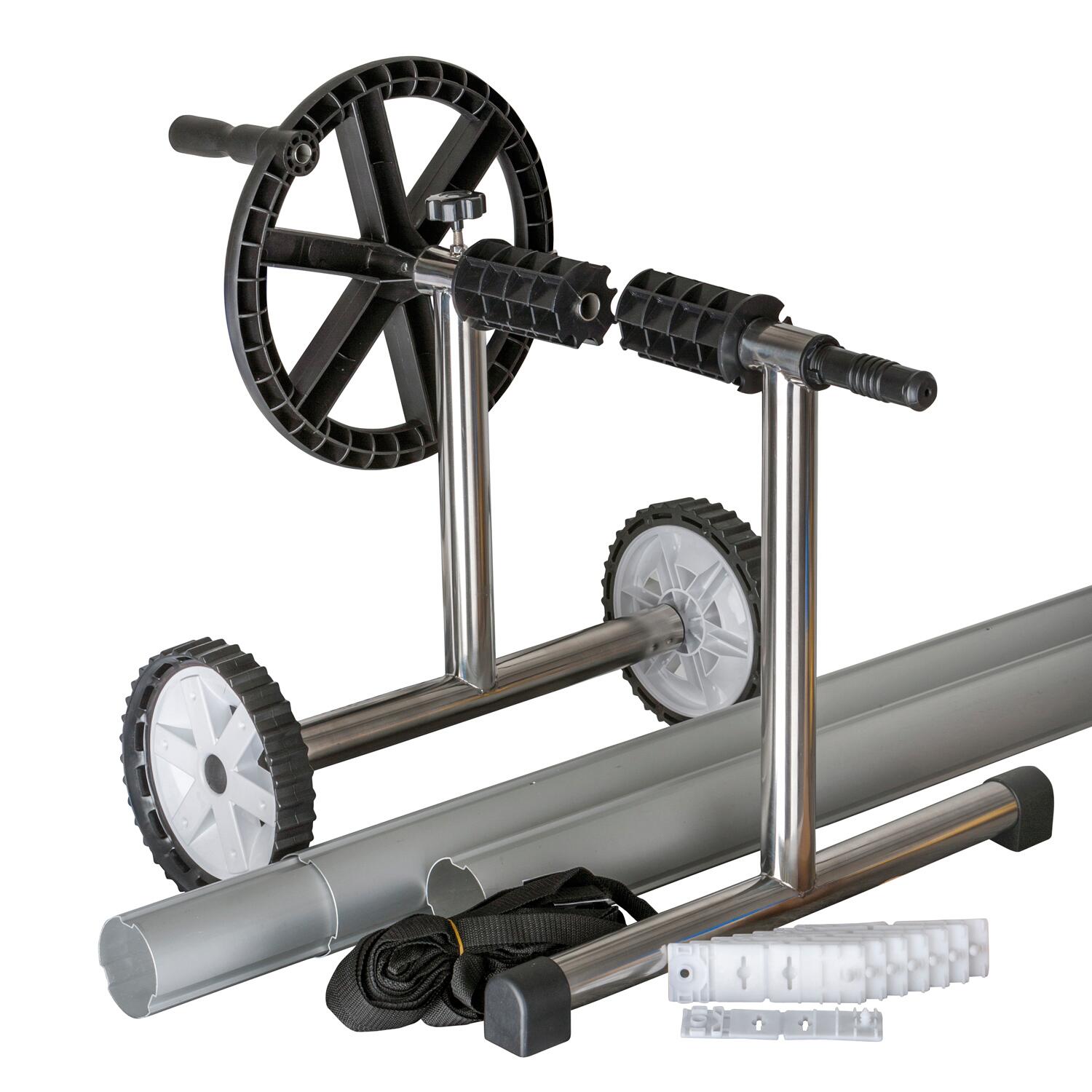 Dotato di ruote, tubo in alluminio anodizzato, ghiera ergonomica con impugnatura rotatoria e kit di fissaggio per la copertura.. Ideale per riavvolgere il telo di copertura di piscine interrate tonde, quadrate e ovali con una larghezza massima di cm 550. Pratico e resistente