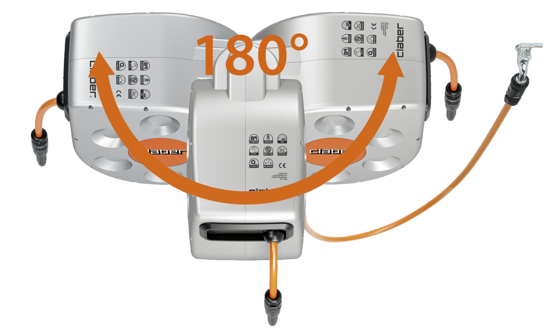 Riavvolgimento comodo e sicuro, pronto all'uso. Fornito di prolunga 1,5 m, presa 3/4", 2 raccordi automatici, lancia a spruzzo e staffe da parete