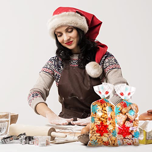 Pacchetto: Riceverai 100 sacchetti di cellophane per alimentari Natalizie con il design unico del fiocco di neve di Natale.