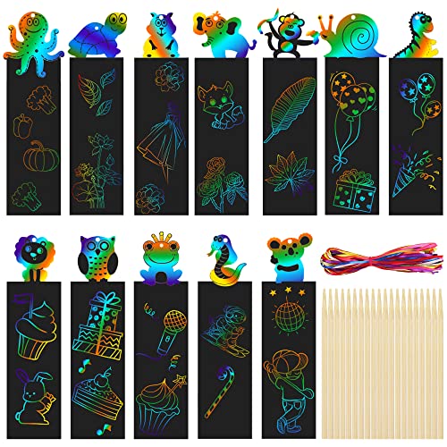 Set di Grande Valore: La confezione include 60pz di simpatici segnalibri arcobaleno da grattare in 12 stili, 60pz corde coloratei e 30pz penna in legno. La quantità sufficiente di segnalibri da grattare è in grado di soddisfare le esigenze quotidiane dei bambini.