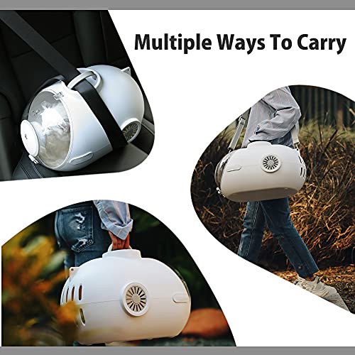 SISTEMA DI ARIA FRESCA: Questa scatola per il trasporto di gatti ha un dispositivo di ventilazione a vortice di aria fresca da 3V, alimentazione d'aria non induttiva a 4300 velocità, 30 secondi per completare il ciclo di ventilazione nella borsa, offrendo agli animali domestici un divertimento più confortevole.Dotato di una scatola di cibo per cani e gatti per fornire cibo sempre e ovunque.