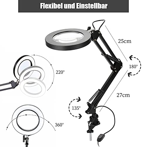 Lampada con lente d'ingrandimento flessibile e regolabile: la testa della lampada può essere regolata di 220° verso l'alto e verso il basso e ruotata di 360°. 25 cm + 27 cm braccio lungo allungabile e può essere piegato. È possibile regolare la posizione della lampada senza oscillazioni a sinistra o a destra, senza cadere