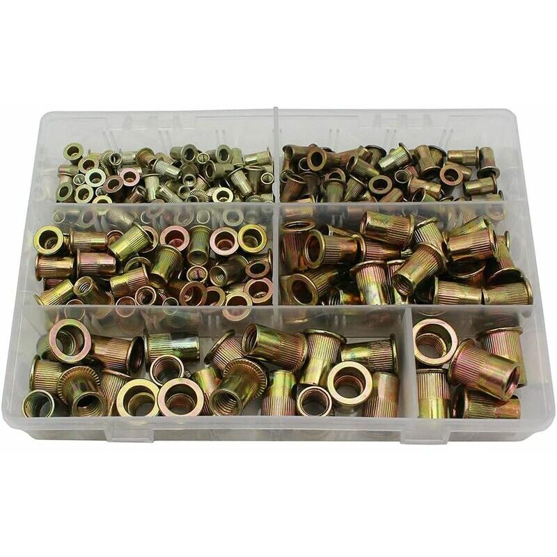 Nome prodotto: dado rivetto a testa piatta in acciaio al carbonio Materiale: acciaio al carbonio, zincato Tipo: piatto La confezione include: M4, M5, M6, M8, M10, M12 Quantità confezione: 210 pezzi