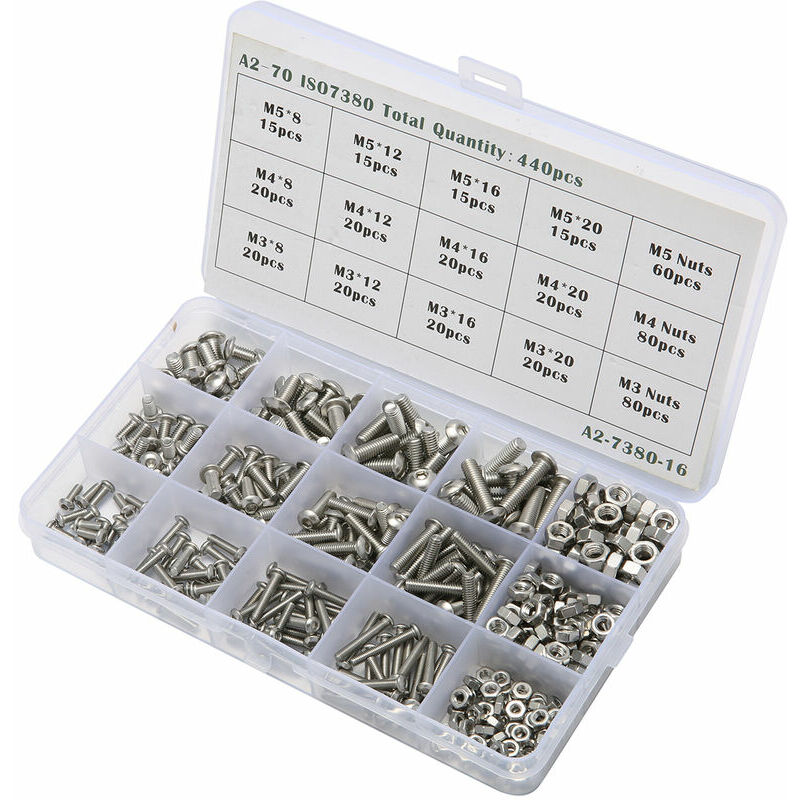 Specifica: Materiale: acciaio inossidabile Tipo di azionamento: esagono incassato Stile della testa: testa a bottone Dimensioni: diverse dimensioni da M3 M4 M5 (include dadi M3 M4 M5 ) Quantità: 440 pezzi Ampiamente usato in elettrodomestici e per ufficio, apparecchiature di comunicazione, assemblaggio di navi e altre industrie di macchinari. Caratteristiche: 1 L'acciaio inossidabile 304 di alta qualità offre resistenza e buona resistenza alla corrosione in molti ambienti. Diverse dimensioni: M3/4/5 2, hanno una superficie di appoggio sufficiente che può essere avvitata più saldamente. 3, ideale per l'uso in aree ristrette dove la testa deve essere a filo o sotto la superficie . 4, Ampiamente usato in elettrodomestici per la casa e l'ufficio, apparecchiature di comunicazione, assemblaggio di navi e altre industrie di macchinari. 5, Questo set è organizzato per dimensione/tipo in una custodia trasparente per un rapido accesso e protezione. La confezione include: 440 pezzi M3 M4 M5 Kit