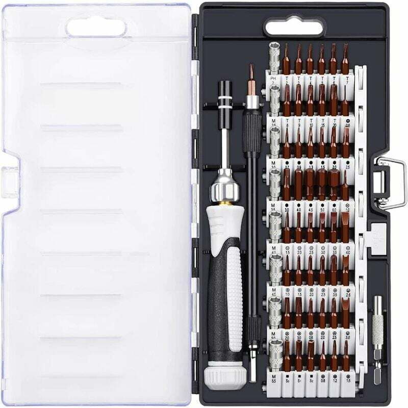 S2 Elevata durezza del materiale in acciaio legato - Durezza fino a HRC60, più resistente del materiale CRV. Non preoccuparti di consumarsi dopo un certo periodo di utilizzo. Durezza del materiale della testa della vite: Durezza: S2> CR-V> GeneraleAcciaio. 【Multifunzione】 Il set di strumenti include 56 punte per cacciavite per la manutenzione di vari dispositivi come iPad, iPhone, tablet, laptop, PC, smartphone, orologio, occhiali, fotocamera, PS4/Xbox, interruttori e altri dispositivi elettronici. 【Asta flessibile】 Se le viti che devi maneggiare sono nascoste negli angoli, sul retro o in altri fronti, l'asta flessibile può essere piegata in qualsiasi direzione desideri. 【Design ergonomico a spinta】 C'è un pulsante PUSS TO OPEN vicino all'interruttore. Finché lo premi, un'intera serie di teste di vite si solleverà in modo da poterne afferrare facilmente una. Una volta rimossi, spingere l'intera fila di punte per cacciavite per ritrarli. 【Portatile】 56 bit e 4 strumenti sono alloggiati