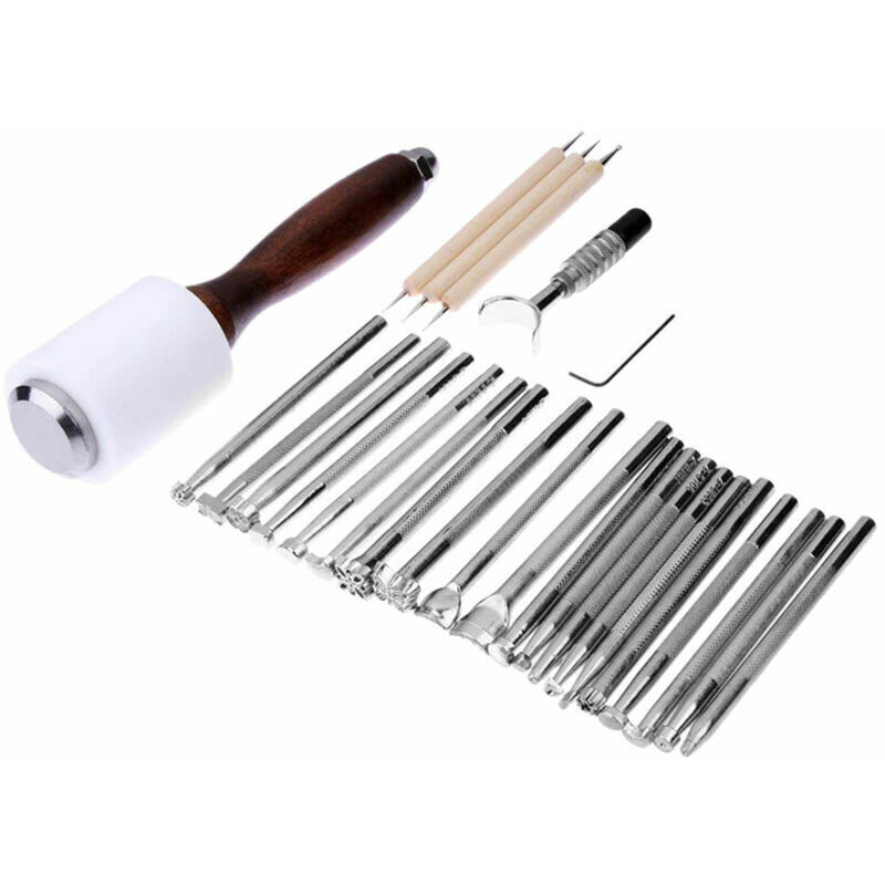 Caratteristiche: Realizzato principalmente in acciaio legato selezionato, elevata durezza e resistenza all'usura e lunga durata. La pregevole fattura garantisce prestazioni stabili e alta precisione. la superficie offre una presa comoda e un'esperienza d'uso eccellente.Due modelli opzionali (26Pcs/28Pcs) tra cui martello, chiave inglese, strumenti per intagliare utensili, uno strumento per punteggiare e strumenti per timbrare.Il martello è realizzato in fibra di alta qualità, legno e acciaio inossidabile, la cui struttura della maniglia adotta un design ergonomico e si adatta perfettamente alla tua mano, riducendo efficacemente l'affaticamento durante la martellatura, risparmiando manodopera e conveniente per l'artigianato in pelle.Con doppia estremità e comoda impugnatura, gli strumenti di punteggiatura da 5 pezzi presentano dimensioni diverse per soddisfare le diverse esigenze quotidiane e possono essere utilizzati per disegno, pittura, intaglio, nail art e altri progetti artistici.