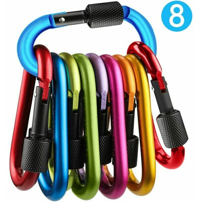 anche attaccato a portachiavi, zaino, borsa-bollitore, ecc. Materiale: lega di alluminio leggera premium. Solido, resistente. multicolore, che è molto accattivante. Chiusura a vite per una maggiore sicurezza. Facile da usare: ha uno sportello a molla che consente di fissarli in modo rapido e sicuro a un'ampia gamma di punti di attacco. Confezione: 8* Moschettone, Portachiavi, Moschettone Portachiavi Moschettoni Gancio D-Ring in alluminio Descrizione del prodotto Colore:Colore1 Moschettone, Portachiavi, Moschettone Portachiavi Uso multifunzionale: Usa il moschettone per agganciare la tua borraccia sportiva, zaino, corde da campeggio per tende, bastoncini da trekking, piccoli attrezzi, ecc. È ideale per appendere corde, maniglie o ganci per tende e altri oggetti. Usato per fissare gli accessori per