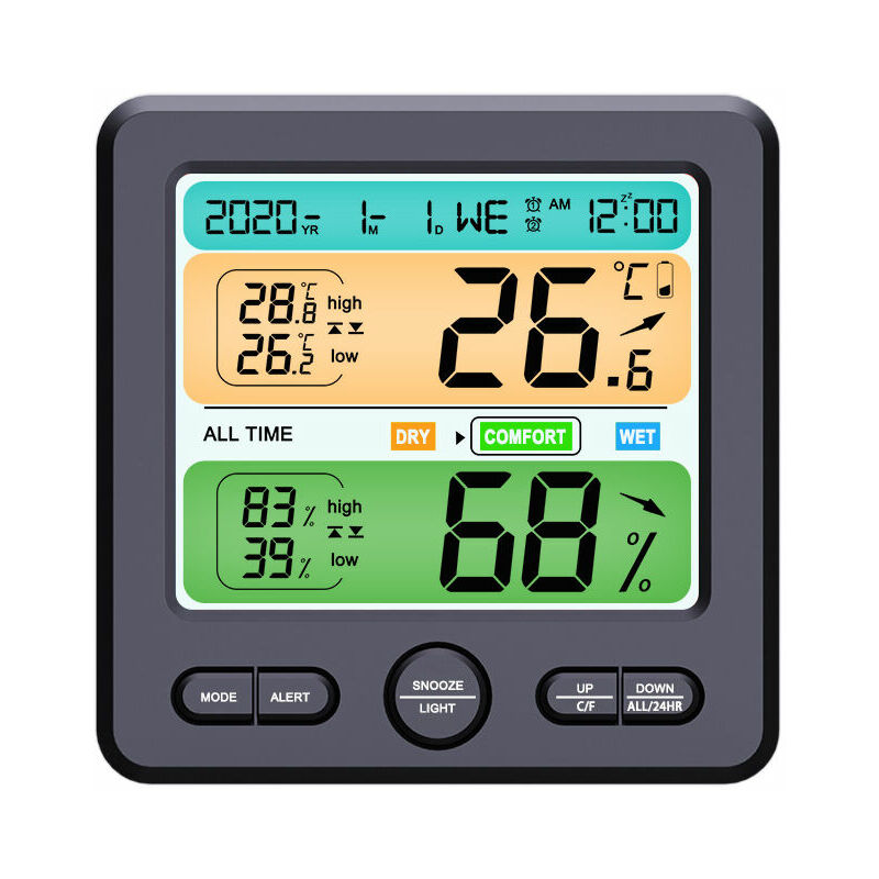 40-70% di umidità confortevole, 40% di umidità secca, 70% di umidità dell'umidità. Visualizzazione della simulazione dell'allarme di superamento del limite: temperatura e temperatura che superano il limite di umidità dell'allarme, la retroilluminazione del limite superiore è arancione, la retroilluminazione del limite inferiore è rosso. Durata silenziosa, due serie di sveglie: durata della sveglia: 2 minuti, tempo di ripetizione: 5 minuti Sveglia 1, sveglia graduale per svegliarti dal sonno;