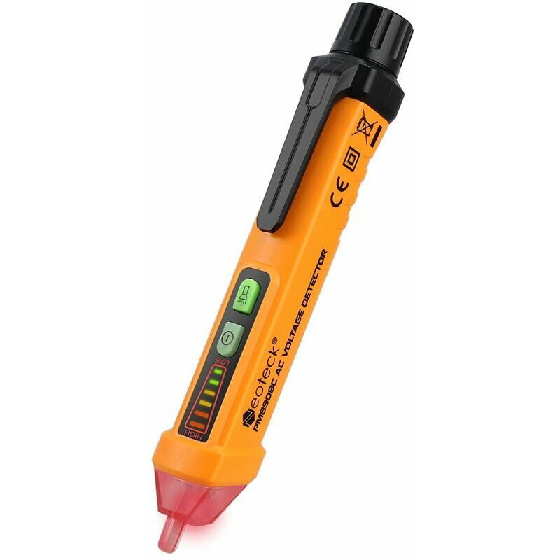 Misura con precisione - Questo tester di tensione può rilevare tensioni: 12 V-1000 V e distinguerle in 3 classi di tensione. BEEP avviserà la sensibilità bassa, media o alta con frequenza diversa e differenza di colore del LED. 【Bucker luminoso】 L'intensità della tensione del tester elettrico viene visualizzata sullo schermo durante il test. Se il LED rosso lampeggia con allarme a ritmo rapido indica che il firewire è stato rilevato. Se il LED rosso non lampeggia, significa che è stata rilevata la linea zero. 【Sicurezza】 Il test senza contatto e il corpo della penna isolato garantiscono la sicurezza. Lampeggia ed emette un segnale acustico quando il dispositivo è vicino alla tensione CA. La tensione può essere rilevata in modo sicuro senza l'aiuto di un elettricista o di un professionista. 【Tester di tensione senza contatto】 L'alloggiamento isolato del rilevatore di tensione garantisce la sicurezza. Lampeggia ed emette un segnale acustico quando la penna del tester di tensione è