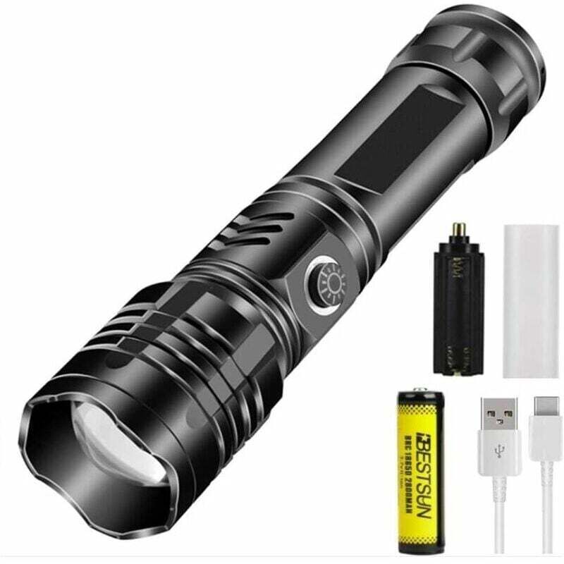Torcia XHP50 super luminosa - : questa potente torcia utilizza l'ultimo LED XHP50, la luminosità può raggiungere i 5000 lumen, la distanza di illuminazione più lontana può raggiungere i 350 m e la luminosità è 4 volte superiore a quella della normale torcia LED T6.< /p> 【Messa a fuoco regolabile e 5 modalità】: la torcia ad alta luminosità ha cinque modalità di illuminazione: alta/media/bassa/stroboscopica/SOS. 【Impermeabile e durevole】: le torce impermeabili con grado di protezione IPX65 consentono un comodo utilizzo in varie condizioni meteorologiche estreme. 【USB ricaricabile e display di alimentazione】: la torcia USB ricaricabile ha lumen elevati ed è alimentato da una batteria al litio ricaricabile da 3,7 V 18560. 【Portatile e ampiamente utilizzato】: questa torcia luminosa è di piccole dimensioni, con un cordino, adatta per attività indoor e outdoor.