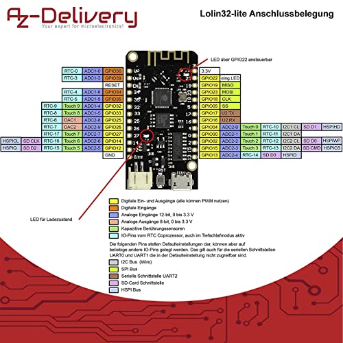 ✅ La scheda AZDelivery LOLIN32 Lite è dotata della nuova ESP-32 Rev1, ha 4MB di memoria flash e supporta WiFi e Bluetooth. Il modulo può essere azionato tramite Micro-USB e offre un'interfaccia aggiuntiva per facilitare il collegamento di una batteria al litio con corrente di carica massima 500mA.