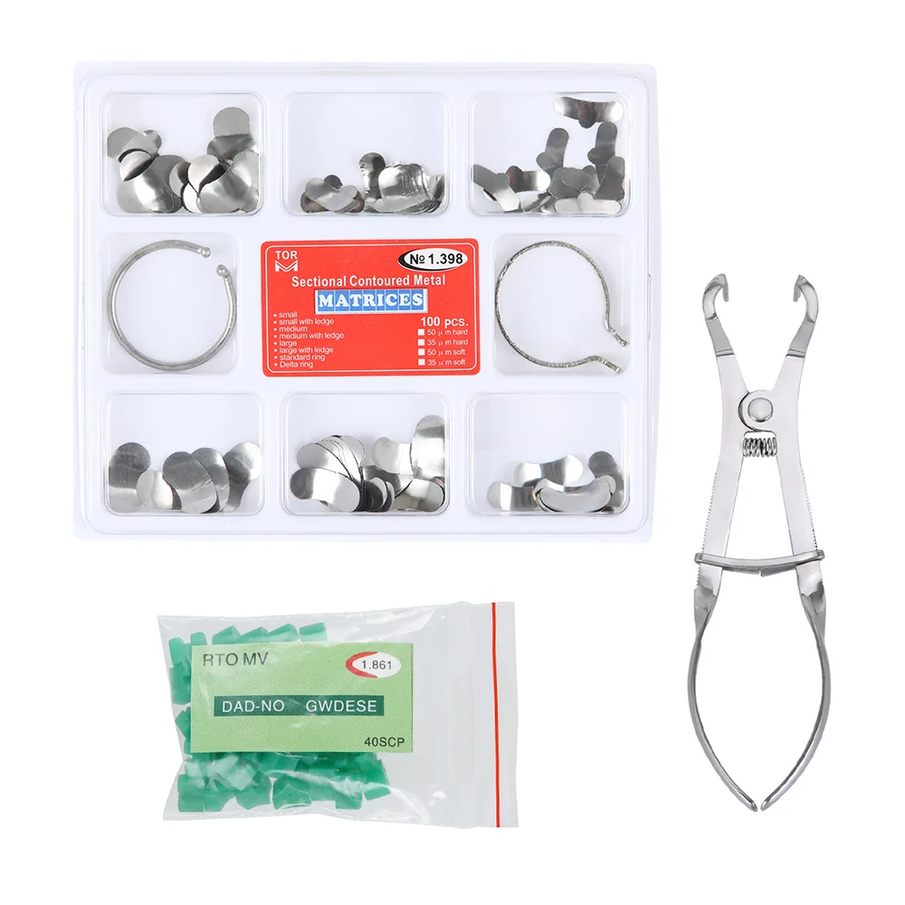 AZDENT 100Pcs Full Kit Dental Matrix Sectional Contoured Matrices +40 Pcs Silicone Add-On Wedges Contoured Metal Matrices Plier