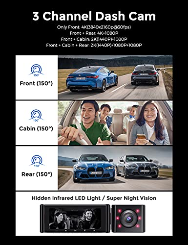 3 obiettivi grandangolari, 170° in avanti e 140° nell'abitacolo e 140° nella parte posteriore. La telecamera di bordo a 3 canali copre un'area più ampia e cattura più dettagli all'esterno e all'interno del veicolo. Perfetta per gli autisti di taxi e ideale per catturare paesaggi e momenti di gioia in famiglia.