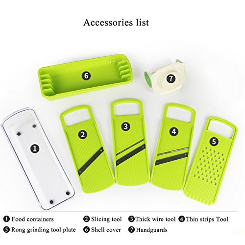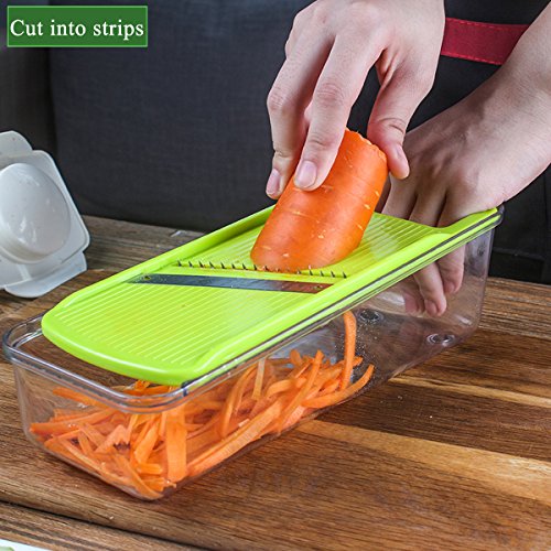Design che permette di risparmiare tempo & contenitore annesso - le affilate lame in acciaio INOX preparano il cibo rapidamente e soddisfano le necessità fondamentali di taglio, come affettare, tritare, schiacciare, pelare e altro ancora. L'affettaverdure multifunzione è dotato di un contenitore per alimenti per raccogliere il cibo affettato e grattugiato, è facile trasferire o conservare i cibi dopo il taglio. Sostituisce perfettamente il tagliere.