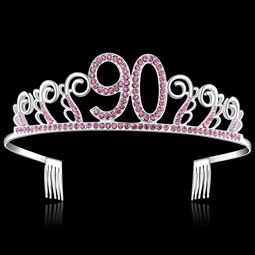 BABEYOND Cristallo Strass Corona Compleanno Tiara Birthday Cerchietto Compleanno Accessore Compleanno 18/20/21/30/40/50/60/90 Annni Strass Argento con Pettine (90 anni Rosa)