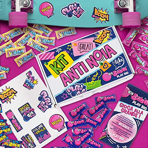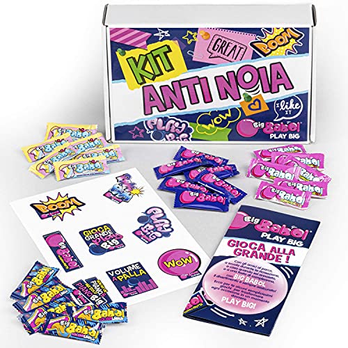 KIT ANTI-NOIA: è una confezione speciale che contiene 130 monopezzi, quattro diversi gusti degli iconici bubble gum con cui fare grandi palloni, una guida al divertimento e degli stickers