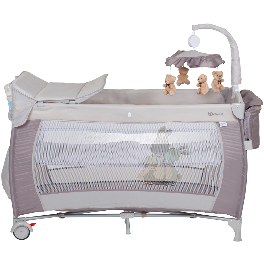 Con il lettino da viaggio babyGO Sleeper Deluxe offrite a vostro figlio un posto comodo e bello per giocare e dormire a casa o in viaggio. A seconda dell'età e delle esigenze del bambino, i materassi possono essere posizionati al livello inferiore o superiore: Il livello superiore è adatto come posto per i neonati, mentre il livello inferiore è adatto per i bimbi più grandi per sedersi, giocare e dormire. La giostrina colorata offre un intrattenimento allegro. Entrambi i materassi sono compresi nella fornitura. Le ruote sul lato inferiore del letto permettono di spostare facilmente il lettino da una stanza all'altra. Il freno di stazionamento assicura un supporto sicuro. La superficie di riposo/gioco ha dimensioni 120 x 60 cm e offre quindi un ampio spazio. Sul lato c'è un ingresso, dotato di cerniera che permette una sicura e facile entrata o uscita. Il lettino Sleeper Deluxe e tutti i suoi accessori possono essere rapidamente e facilmente riposti in una borsa da viaggio. Altri dettagli del prodotto: 2 rotelle e 2 stopper Freno di stazionamento Materasso per lettini da viaggio Con giostrina musicale e animaletti peluche (possono essere diversi dall'immagine) Fasciatoio rimovibile con cinghia di sicurezza 2. livelli di sdraio Tasca laterale Ingresso laterale Borsa da trasporto Dettagli tecnici: Peso: 10,6 kg Dimensioni: 83 x 60 x 120 cm
