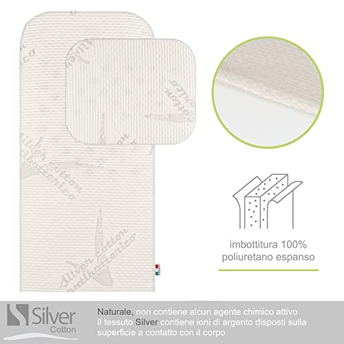 ANTI BATTERICO e ANTI OODRE: il rivestimento "Silver AG+" del Materassino Culla Neonato è Dotato di Ioni Di Argento Che Interagiscono con la Membrana Batterica Annientandola e Bloccandone la Riproduzione. L'argento Applicato Resiste ai Lavaggi e nel Tempo