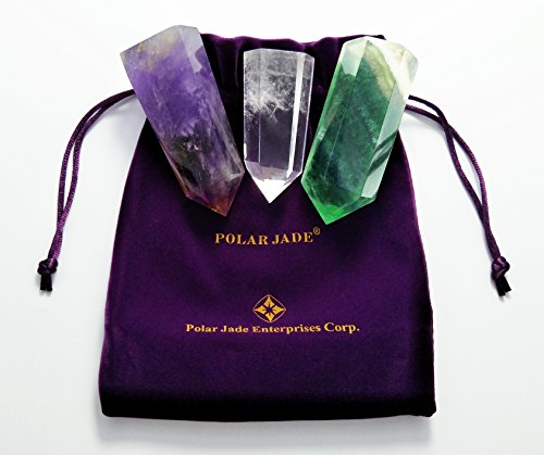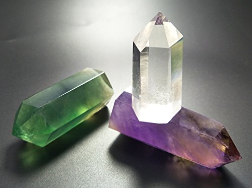 Set di 3 bacchette di cristallo curativo composto da 3 pietre: quarzo trasparente, fluorite e ametista, prisma sfaccettato appuntito, bacchette per reiki, chakra, meditazione e terapia, decorative
