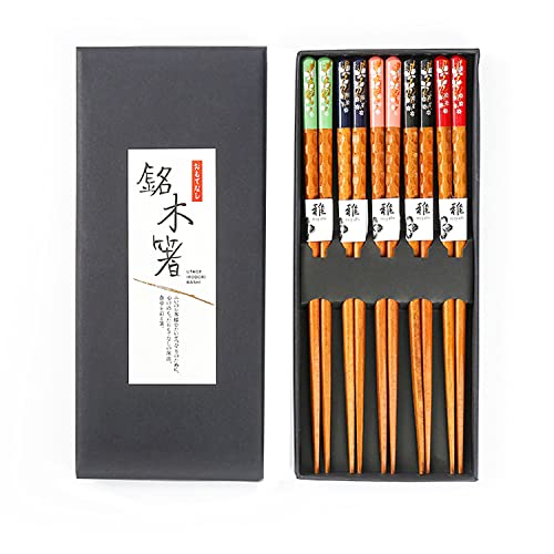 5 Paia Bacchette in Legno Massello a Punta in Stile Giapponese per la Casa - Multicolore Riutilizzabili Bacchette Lavabili in Lavastoviglie, Bastoncini Cinesi con Motivo a Fiori di Ciliegio, 22.5 cm