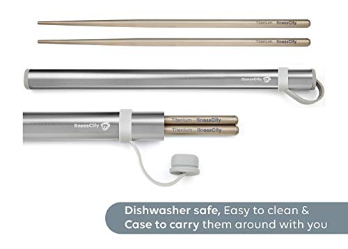 LEGGERE & RESISTENTI: finessCity bacchette in titanio puro sono molto resistenti e leggere e facili da maneggiare. Sono bacchette perfette per un set regalo per ogni occasione. Puoi usarle facilmente per mangiare Sushi, Noodles o riso. Ciascun set di bacchette pesa soltanto 14,5 g, entrambe le bacchette si presentano le stesse dimensioni e lunghezza, ossia 0,75 cm di diametro e 22,9 cm di lunghezza. Sono bacchette arrotondate.