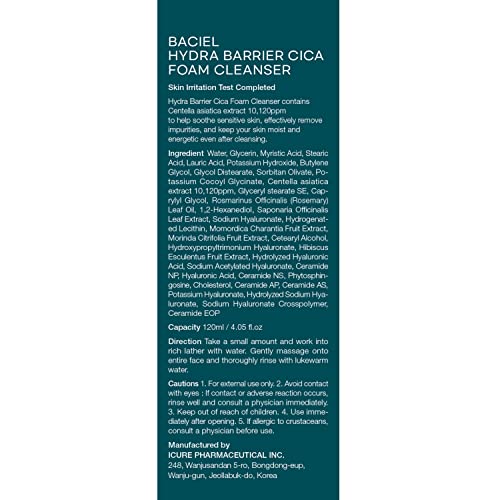 BACIEL - Hydra Barrier Cica Foam Cleanser 120ml | Cura della pelle coreana | Detergente viso | Pelle sensibile | Ceramide | Acidi Ialuronici