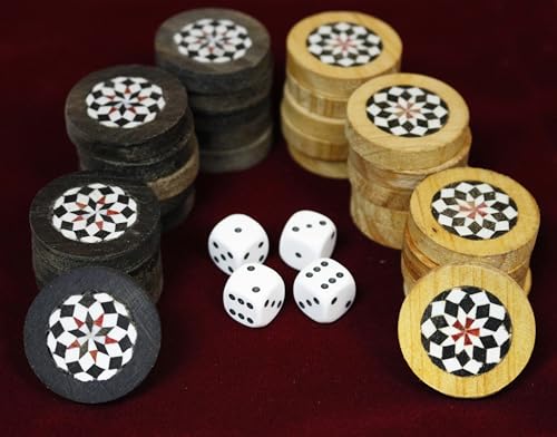 Backgammon DAMA - Pietre a mosaico in legno, realizzate a mano, 30 pezzi, con 4 pietre cubi (diametro 33 mm)