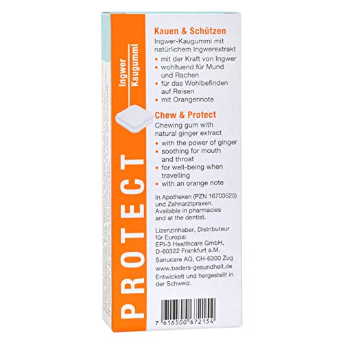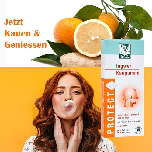 BADER PROTECT della farmacia. Le gomme da masticare allo zenzero. Con le sostanze pungenti dei gingeroli. 3 x 20 quadratini di gomma da masticare
