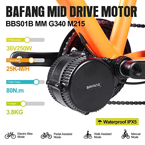 【Sistema a motore centrale】BBS01B 36V 250W G340 Serie M215 Motore centrale con sensore di velocità incorporato, coppia massima 80Nm, offre maggiore supporto. Economico e di facile manutenzione. Adatto per mountain bike, bici da strada, bici da pendolari. Si sconsiglia l'installazione su biciclette in fibra di carbonio per evitare di danneggiare il telaio. Con tre modalità, modalità elettrica, modalità a pedalata assistita e bici normale, soddisfa le esigenze del pendolarismo quotidiano