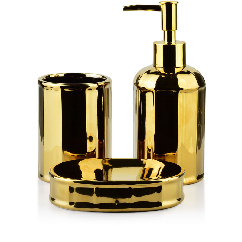 Set da bagno della collezione CIRI GOLD di BATHLAB by MONDEX. Set da 3 pezzi in ceramica in oro massiccio! Il set da bagno CIRI si adatta perfettamente a qualsiasi bagno moderno. Il design moderno aggiunge carattere alla tua stanza garantendo al contempo una durata a lungo termine. Il set è realizzato in ceramica di alta qualità con pompa dorata. Il set di sapone in ceramica CIRI di BATHLAB è una collezione da bagno di alta qualità, ideale per modernizzare qualsiasi bagno moderno. Realizzato in resistente materiale ceramico, il set è composto da tre elementi: un dispenser per sapone, un portasapone e un bicchiere per spazzolini. Il design elegante e moderno della ceramica dorata si adatta facilmente a quasi ogni arredamento del bagno. Dispenser: 350 ml, 7 x 8 x H 17,5 cm, tazza: 390 ml, 7 x 7 x H 12 cm, portasapone: 12,5 x 9 x 3 cm, pompa: oro, dimensioni imballo: 19,5 x 22 x H8 cm, peso dell'intero set: 718 g/812 g con imballo iconfezionato singolarmente in eco-box con custodia in