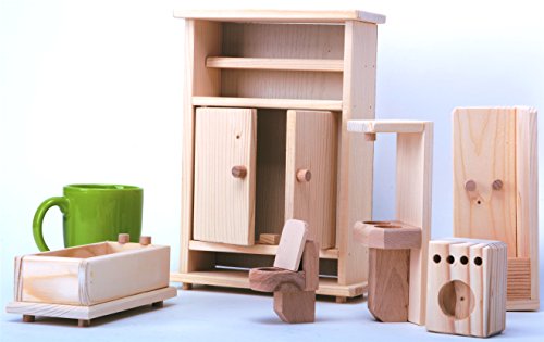 Questo set di 6 pezzi di mobilio per bambole in legno di pino è perfetto per bambole Barbie. Bambole non incluse. Materiale: Legno naturale di pino. Questo prodotto non contiene prodotti chimici tossici. La scatola include 6 pezzi: 1 vasca da bagno, 1 water, 1 lavandino, 1 lavatrice, 1 cabina doccia e 1 armadietto bagno